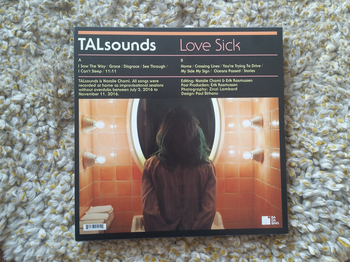 Love Sick reveals TALsounds as a remarkable anomaly in an era of bedroom producers and laptop-abetted pop projects - capable of sculpting dense fields of sound in live takes and channeling improvised vocal performances into emotional frameworks that betray no defects for their process of instant conception. Quite simply, this way of making music has become second nature for Chami. Distinctions between genres and performance style give way to the clear limitlessness of her musical practice, the experiments of her workaday recording regimen. Her art floats with a body and character not quite identical to her own, pressed into fluid and squeezed of symbolism. TALsounds paints Love Sick from moment to moment with clouds of abstraction and ambiguity, while understanding with some cosmic certainty that this music is the only appropriate form through which to communicate her own depths.